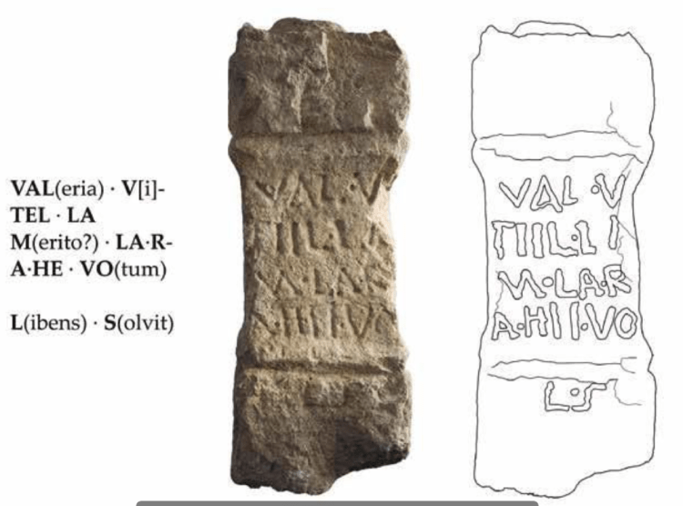 NOTA ARQUEOLOGICA: El hallazgo, por parte de la Sociedad de Ciencias Aranzadi, de un ara o altar votivo del siglo I d. C. en el monasterio medieval de Santesteban en el monte Arriaundi, en Larumbe (Navarra), territorio de los vascones, ha llamado la atención porque contiene una inscripción en latín en la que una mujer llamada Valeria Vitella hace una dedicación a la divinidad vascona de nombre Larrahe, lo que nos muestra, de nuevo, la convivencia entre las gentes de origen vascón latinizadas y la pervivencia del culto prerromano.