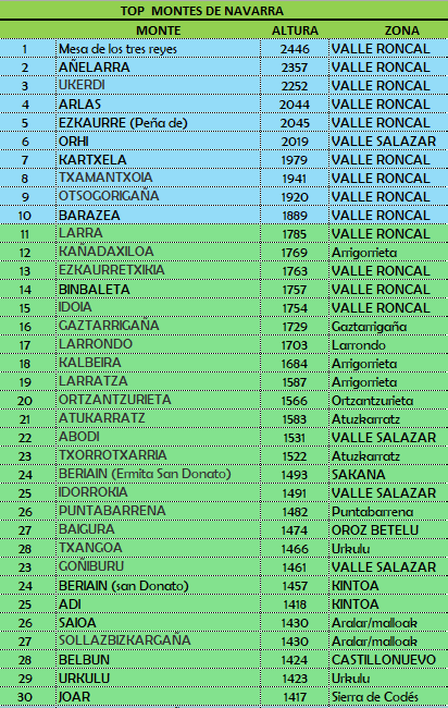 En total -según la guía de Montes de Navarra de Juan Mari Feliu (Sua Ediciones)- hay catalogadas 522 cimas (en wikipedia nombra algún listado de 679 montes), de ellas y según la clasificación de Mendikat 215 serían de categoría especial 1+ y primera. El TOP 30 sería: